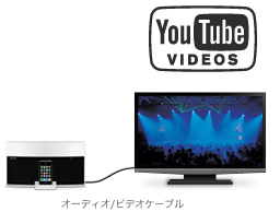 連接上複合AV端子,你可以透過iPod/iPhone傳輸YouTube的影像到電視上來享受大畫面的影像訊號,而且iPod和iPhone能一邊充電一邊瀏覽畫面。 |
