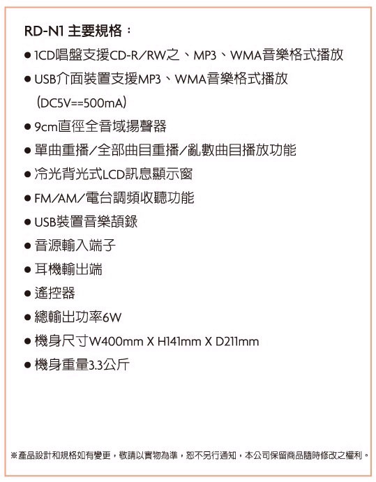 l i-Pod 連接座 X 1 l 3W輸出功率l CD轉 USB 裝置介面之MP3/WMA音樂格式錄製播放l 支援播放格式 : CD, CD-R/RW, MP3/WMA (CD-R/RW/USB) l FM / AM 電台調頻收聽l機身與喇八尺寸 / 重量 400×141×211mm/3.3kg