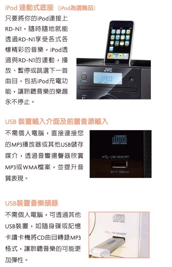 在RD-N1的主機機頂上搭載了iPod專用連接座。放上您專屬的i-Pod,輕輕鬆鬆享受您的音樂, 同時並自動地進行i-Pod充電與遙控連動,全時盡情地享受iPod與RD-N1所為你帶來的享樂生活(i-Pod / i-Phone為選購配件)