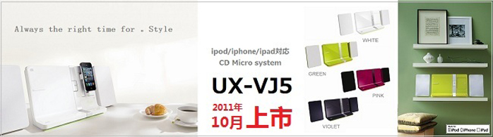 四種個性化色彩的類平板鏡面機身設計 魅力四色的UX-VJ5在機身的設計採用優雅簡潔的四種個性化色彩的類平板鏡面機身設計, 機身的左側採隱藏式馬達驅動上升式CD艙門,機身中間則具有隱藏式i-Pad Dock,輕輕按壓, Dock昇起,即可連結上您的i-Pad,主機的右側則採取隱藏式翻轉艙門,可連接您手上的i-Phone或i-Pod, 更特別的是,可轉動這個Dock,進行i-Phone或i-Pod水平置放或直式置放! 別出心裁~