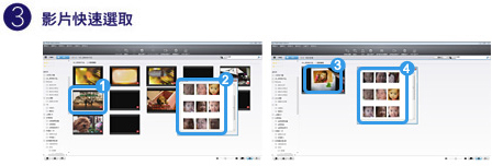 1.選取影片 2.自動搜尋影片中的人物 3.指定人物 4.自動找出內含指定人物的影片 ※ 以「景物」、「人物」選擇特定 目標,快速找到你要的影片
