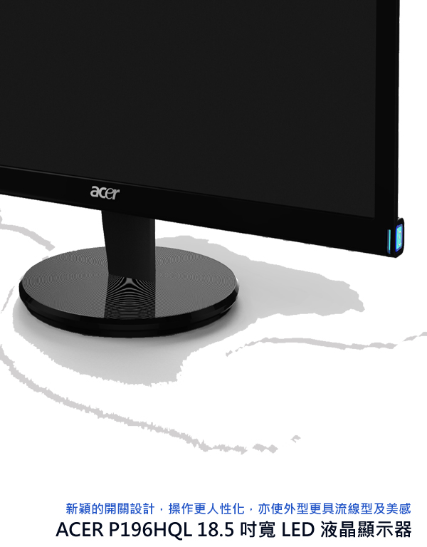 LED 超效能背光節能環保,16:9享樂顯示比例 12,000,000:1超高動態對比 P196H擁有16:9比例及高畫質影音的顯示規格,提供絕佳的劇院級視覺效果。戲畫面及多媒體內容的最佳選擇。極速2毫秒反應時間及1200萬:1(ACM)動態高對比,不論是玩3D遊戲或播放影片皆逼真犀利。高雅的邊框設計搭配鋼琴烤漆,適合任何現代化的家居設。P196H還擁有 5 毫秒快速的訊號反應時間,可減少消費者玩遊戲或看電影時產生的殘影或動作模糊現象,搭配ACM(Acer Adaptive Contrast Management)技術,畫質呈現高對比,LED超節能背光,可使色彩更飽和鮮豔,影像更加鮮明清晰。在操作鍵方面,宏196H改採新穎的開關設計,操作更人性化,亦使外型更具流線型及美感。 商品特色:•LED背光模組 LED背光模組,不只高效能,更讓您為地球盡一份心力。 •16:9寬螢幕,工作休閒兩相宜 ,兩個文件同時運作最輕鬆,觀看電影不失真。•動態高對比1200萬:1(ACM),給你更卓越的視覺感受,畫面呈現更鮮豔。 •5毫秒反應時間,細節不放過 ,讓您的畫面可以得到更清晰與及時的影像。•高質感黑晶鋼琴烤漆,風格獨具 ,與室內整體設計的相互搭配。
